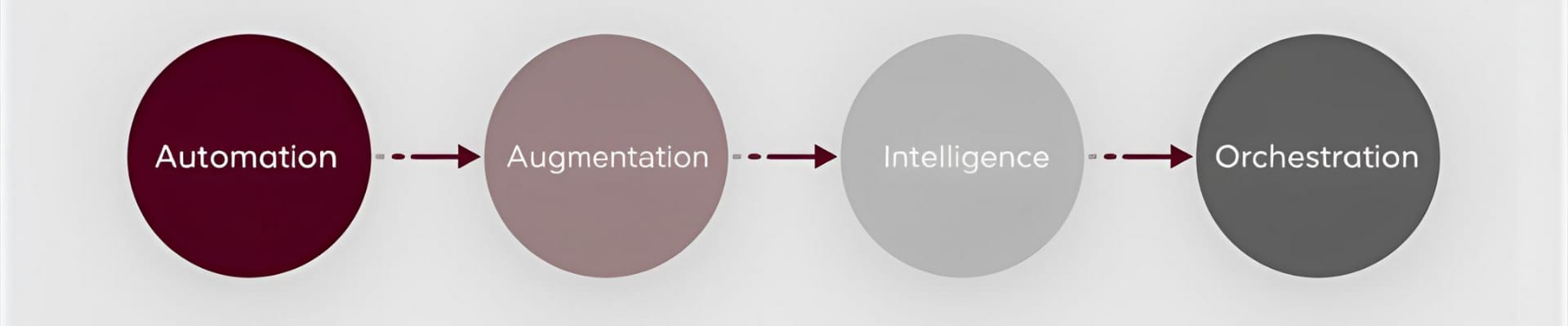Progressive AI Implementation changes that by introducing structure and sequence. It’s a maturity curve that moves from Automation, to Augmentation, to Intelligence, and finally to Orchestration — the point where intelligence becomes operational, not ornamental.